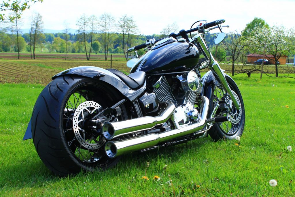 Dragstyle Umbau einer Yamaha XVS1100 mit Air ride System und 240/40/18 Breitreifen und TTS Schwinge.